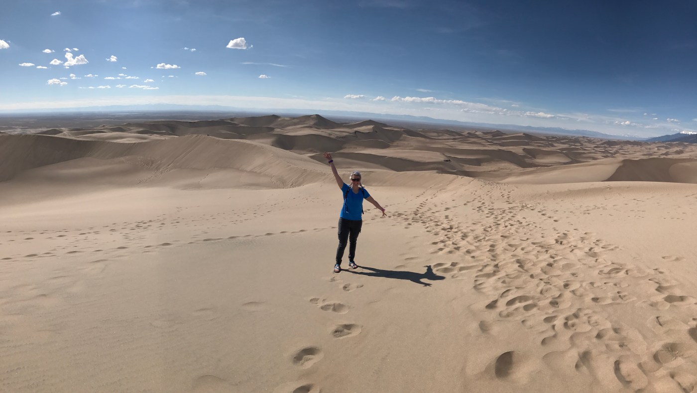 I then drove another 4 hours east to Great Sand Dunes National Park. There I joined hundreds of people playing on the dunes. I hiked to High Dune and was rewarded with an amazing view. I watched people sand board and soaked it in at the top. I then headed down, running down the steep parts (so fun) and headed to my reserved camping spot at Sand Dunes Swimming Pool and RV. It was a nice little spot. I was happy to take a shower and get the sand off. I watched the sun set and soaked in the alpenglow on the Sangre De Cristo Mountains beyond the dunes.