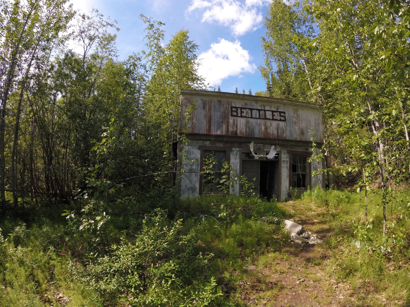 A little before 1500 we arrived on the banks of Old Bettles. We dawned our bug gear. For the first time in Alaska, I put on DEET. We ventured back into the bush to find the old buildings. The first house displayed gorgeous moose sheds. The mosquitoes were fierce as we walked through the brush.