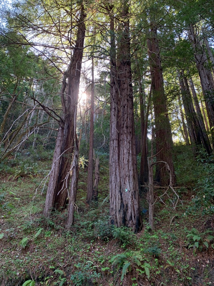 I got myself back together again and kept moving. Alternating between running and walking as the trail rolled up and down some gentle hills. Making my way into Mitteldorf Preserve, I looked around in awe. Colossal redwoods began to tower over and around the trail. Many of these giants had been burned in the Soberanes Fire but were resilient. Mitteldorf Preserve is home to the largest redwood tree in Monterey County.