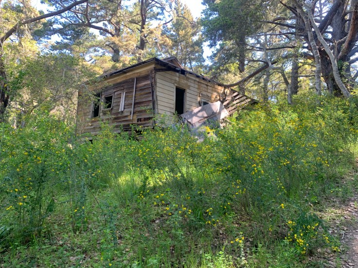 The steep hill continued upward and an abandoned cabin came into view. A sign for the Corona Cabin was placed at the last volunteer station, so this must be it. The yellow cabin was dilapidated and brush grew up all around and in the cabin. Not a terrible spot to live though. It certainly was beautiful here. That was proven even more so as I crested the ridge and was able to see out toward more mountains, trees, and sun.