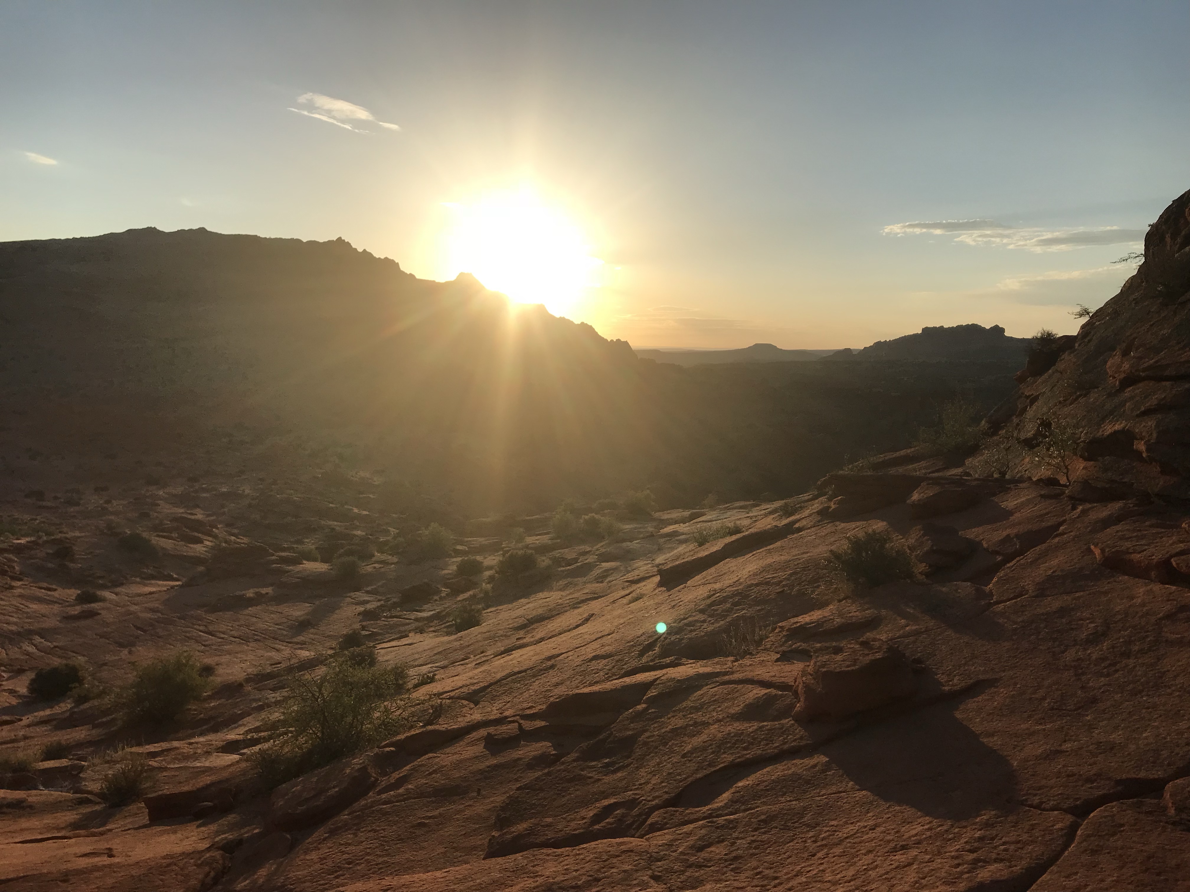 The sun bathed us in its warm embrace. A desert sunrise is always something so behold. The interesting buttes of the area caught and cast shadows across the rocky and sandy landscape. The rocks glowing brilliant hues in oranges, reds, and beiges. There was no doubt in our minds that we might be the luckiest two people and dog on the earth at that moment.
