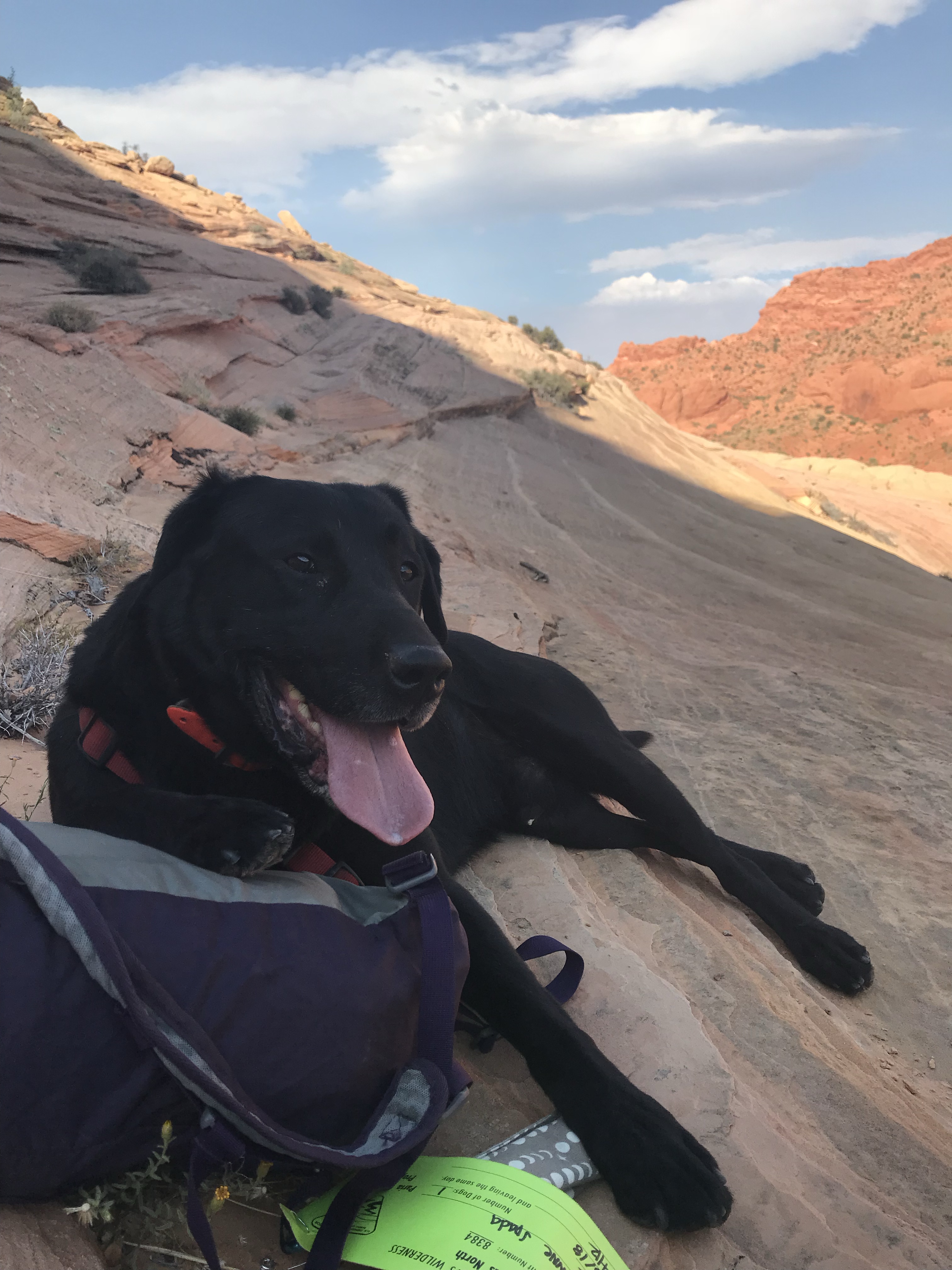Soon we made our way to climb onto some slick rock hoping we were in the right place. The trail isn’t extremely difficult to follow, but some route finding skills and confidence in desert terrain were definitely needed. Buzz came with us joyfully climbing the rocks. A total natural. The sky was brightening up and sun rays were extending to the rocks that rose above us to the right.