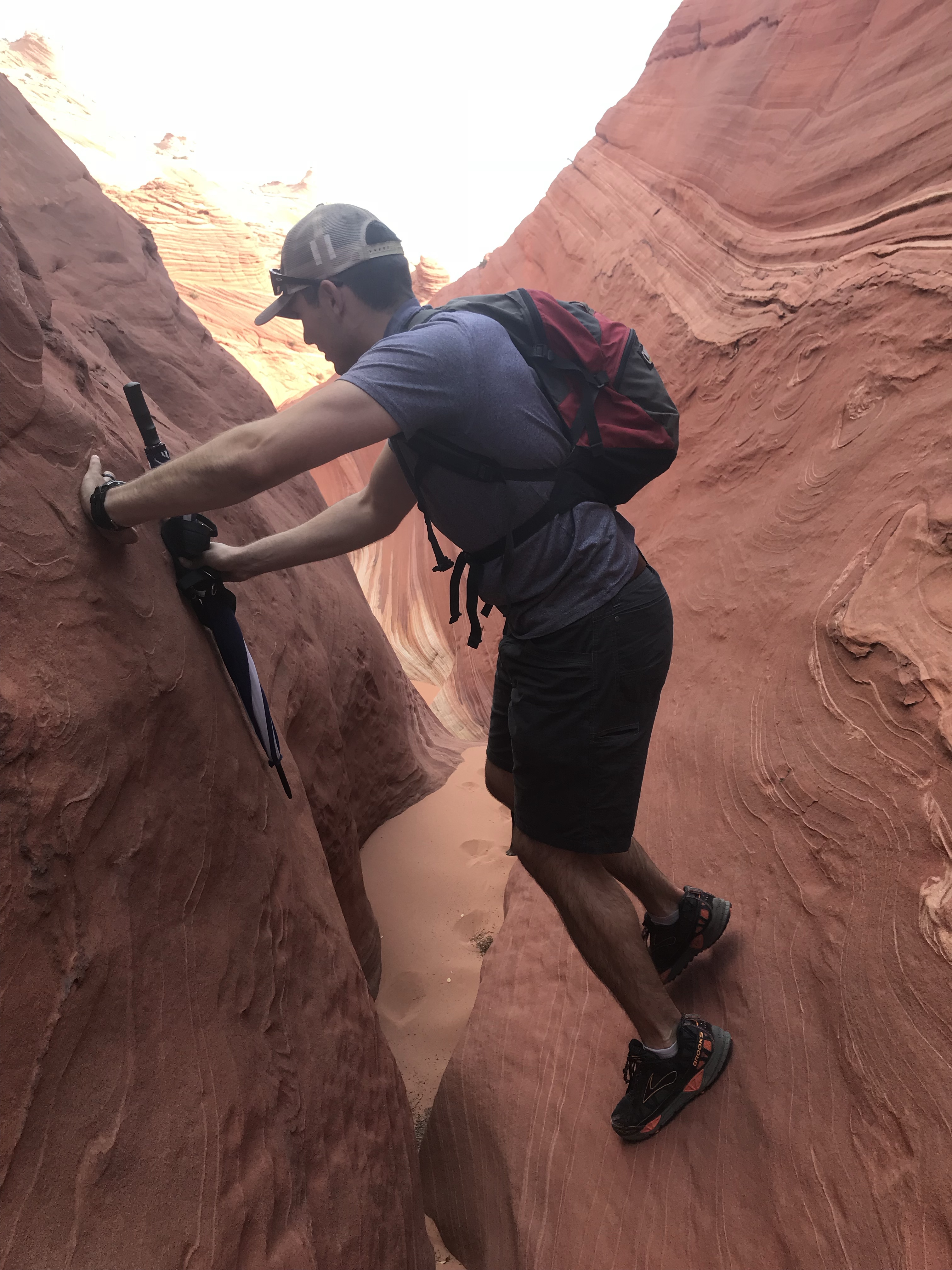 In an effort to mix it up a little bit on the way back, we crawled down the area we were into a canyon wash. Some of the tight walls and deep sand made for an interesting hike. It was fun and intimidating to not know what was around the next corner. In the end it was passable and a lot of fun to navigate safely back into the sandy valley we left hours ago to climb into The Wave.