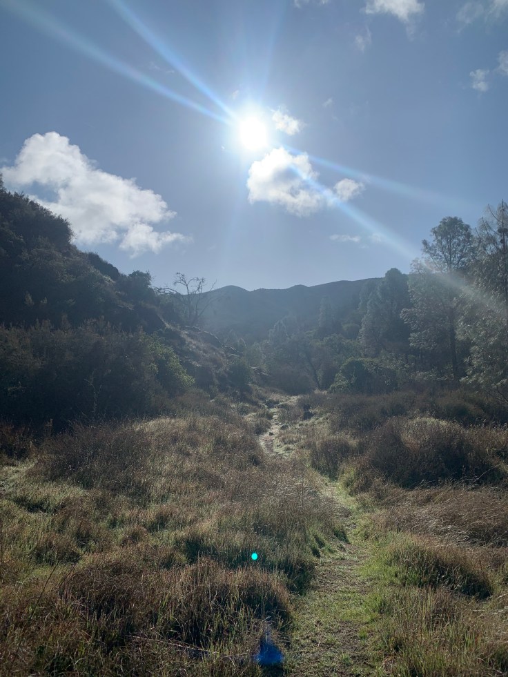 I was layering down quickly as the sun lit up the frosty grass in the valley. As soon as the trail started going uphill I had to remove all my extra layers. I stopped and loaded them into my vest as the temperatures quickly climbed.
