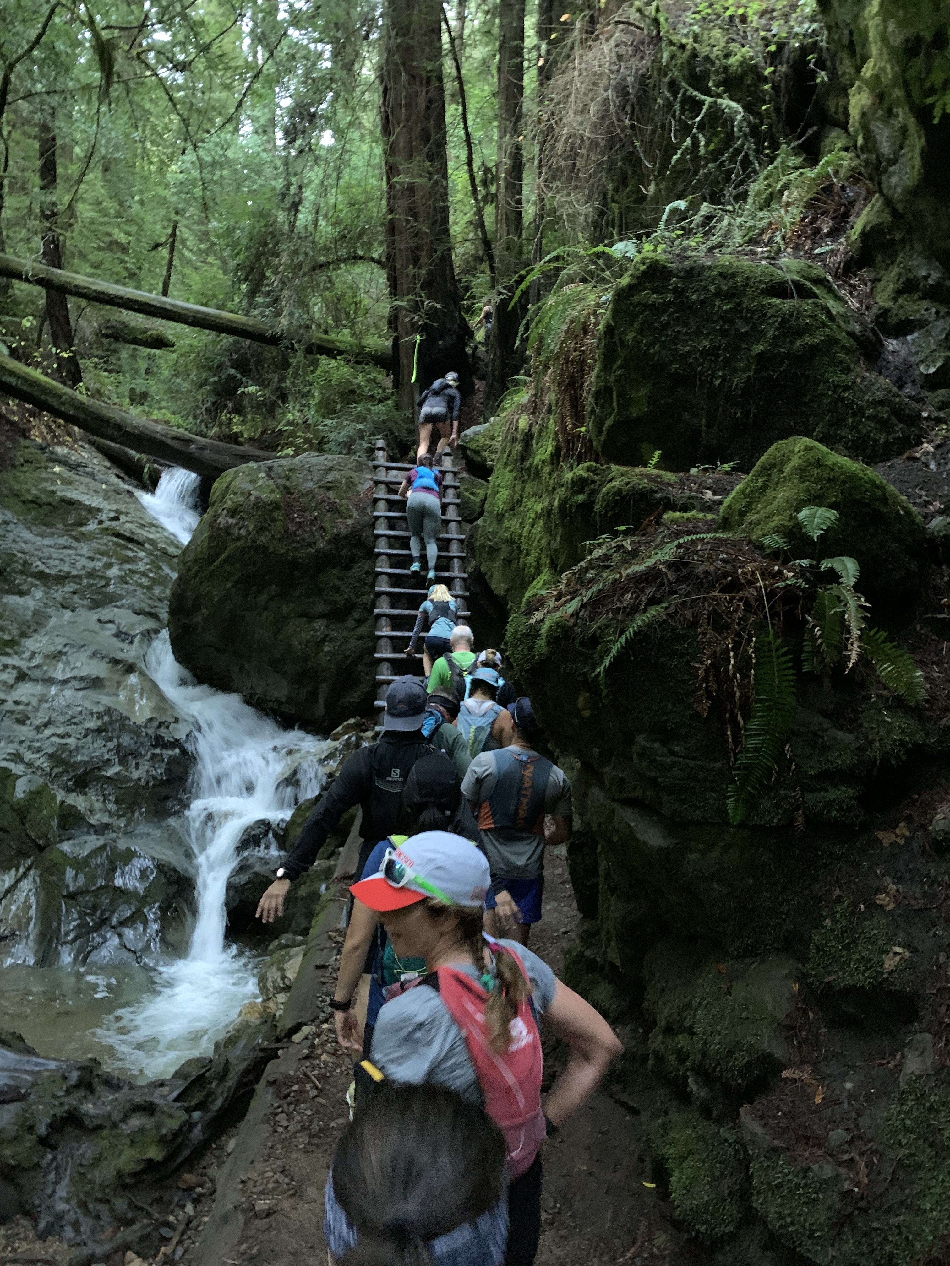 I ran when I could, but found myself mostly walking. I was nervous about going out too hard and blowing up later, but I also wanted to get past as many people as possible. The crowded start spread out somewhat as we headed down into the Steep Ravine trail. It was damp and so green. The creek was flowing wildly from the heavy rain earlier in the week.
