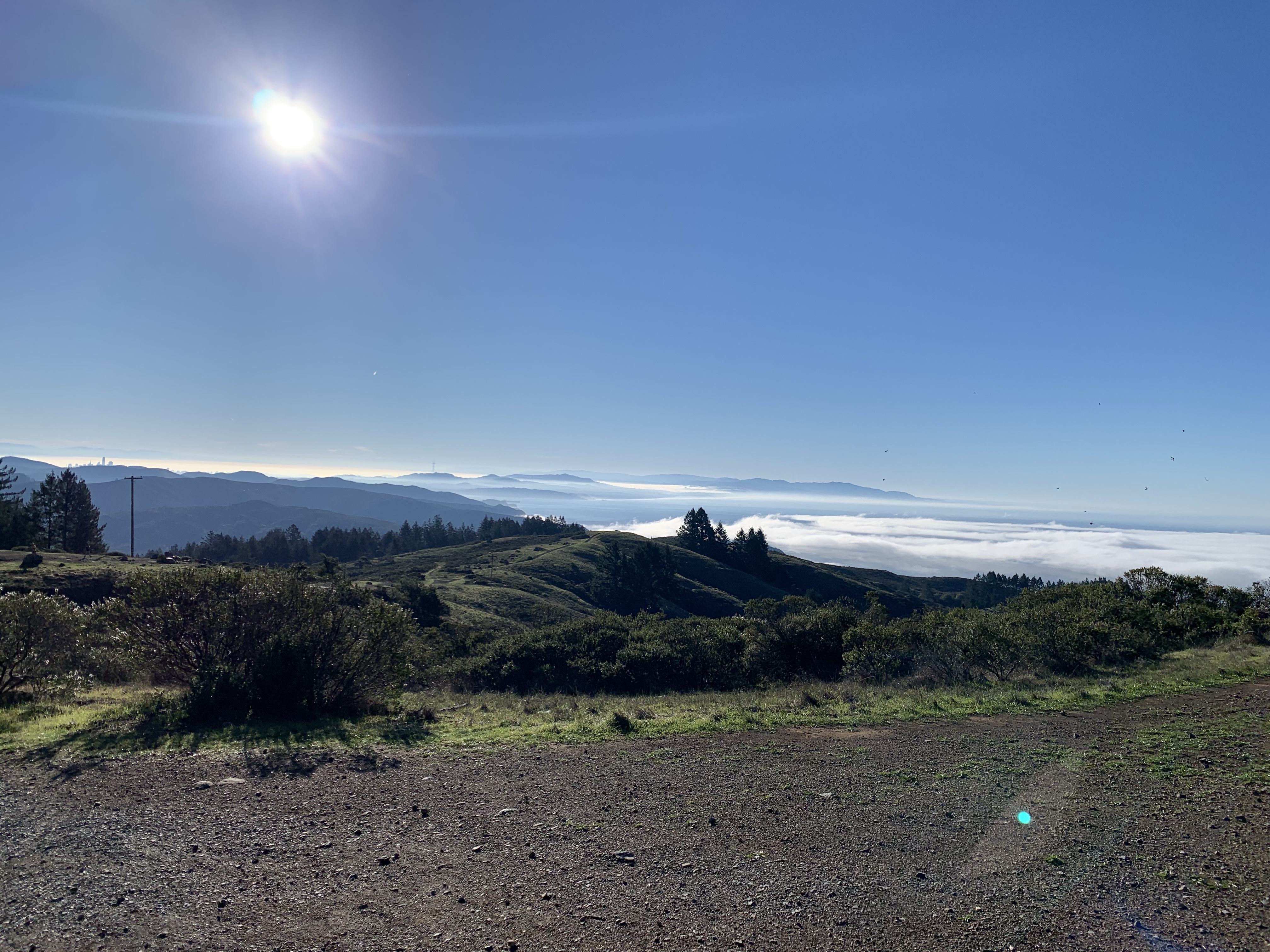 I was able to run the gentle grade downwards as the trees thinned out and then broke away completely to a grassy knoll. Views opened up to the south and west. The Pacific Ocean and coastline spread out into the distance and San Fransisco came into view. I stopped to take a picture and admire the view.